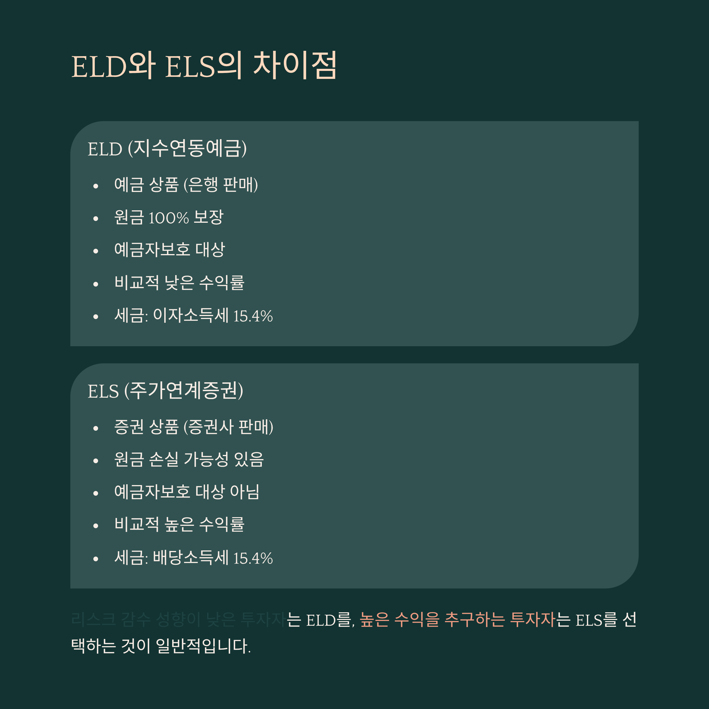 ELD는 '예금'이라는 안정적인 틀 안에서 수익을 기대할 수 있는 반면, ELS는 원금 손실 가능성을 감수하면서 높은 수익률을 노리는 상품이에요. 투자 성향에 따라 선택의 기준이 확연히 갈리는 부분이죠.