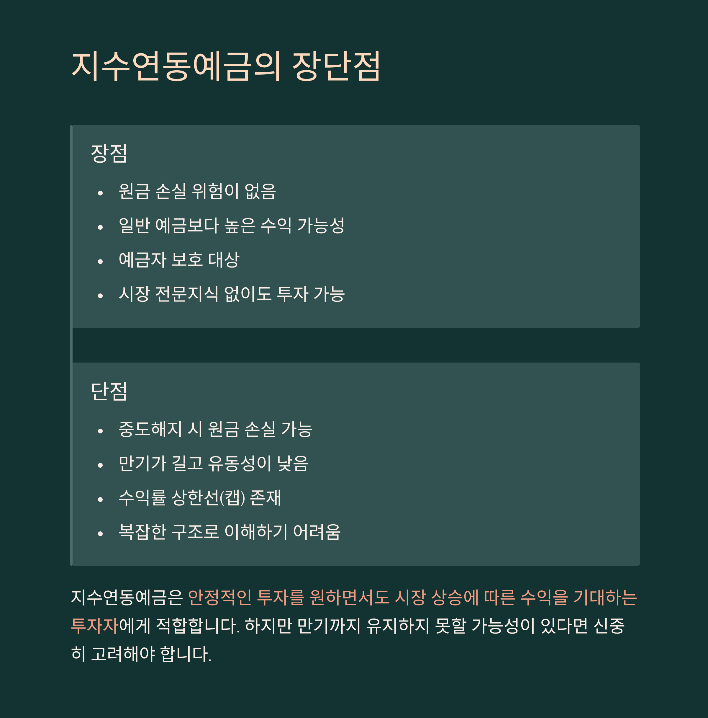 수익이 생기지 않더라도 원금은 전액 보장된다는 점이 심리적으로 안정감을 줘요. 하지만 ‘예금’이긴 해도 원금 외에 이자를 기대하려면 조건을 충족해야 하기에 기대만큼 수익을 얻기 어려울 수도 있어요. 이 점은 반드시 이해하고 접근해야 해요.